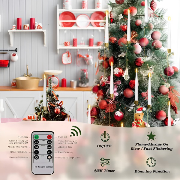 Naudodami 10 mygtukų nuotolinio valdymo pultą galite reguliuoti žvakių ryškumą, pasirinkti vieną iš keturių šviesos režimų ir nustatyti 4 arba 6 valandų laikmatį – tai suteikia patogumo ir lankstumo dekoruojant.